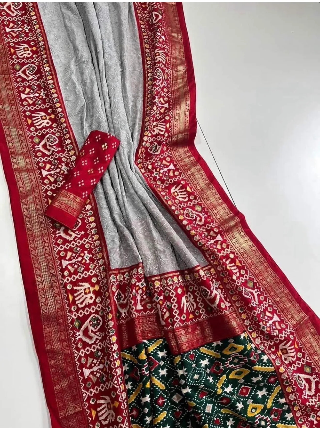 The saree showcases Patola print work combined with traditional woven zari border and an ikkat-style printed or woven pattern on the pleats and pallu.