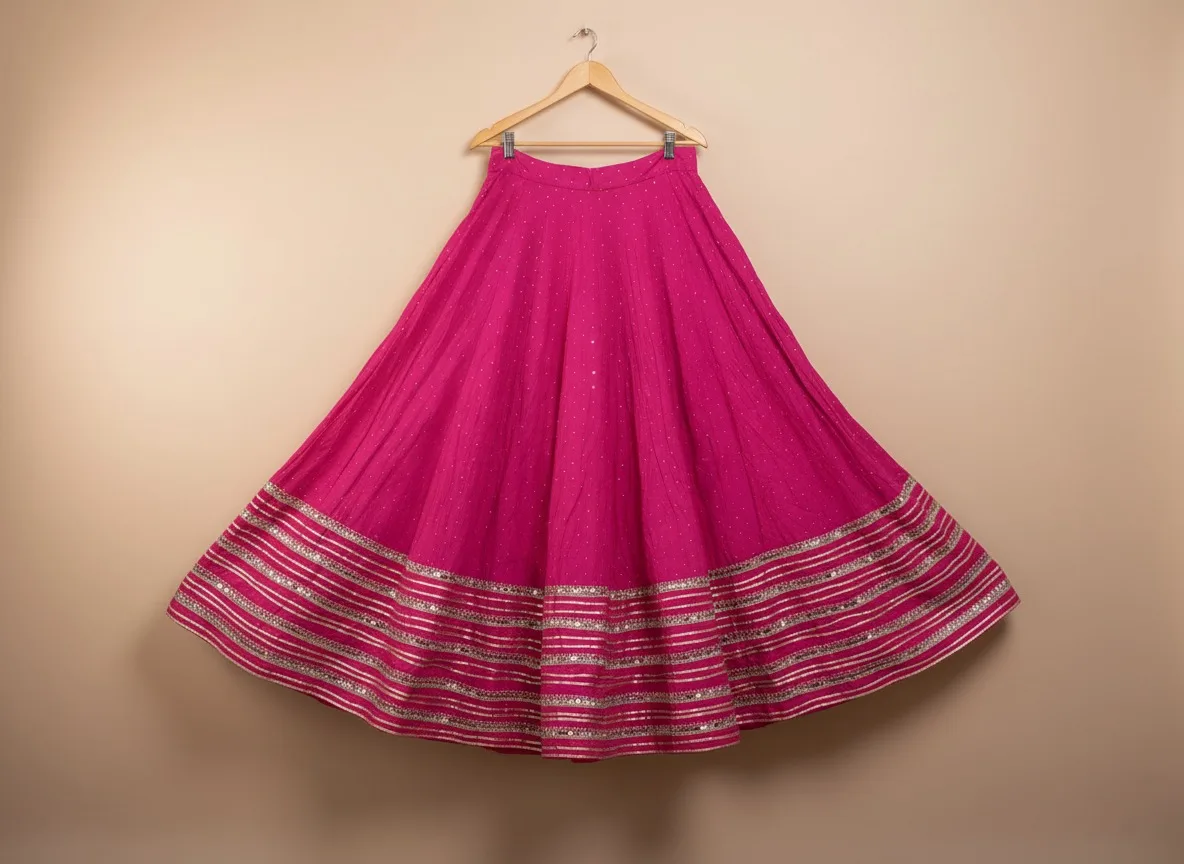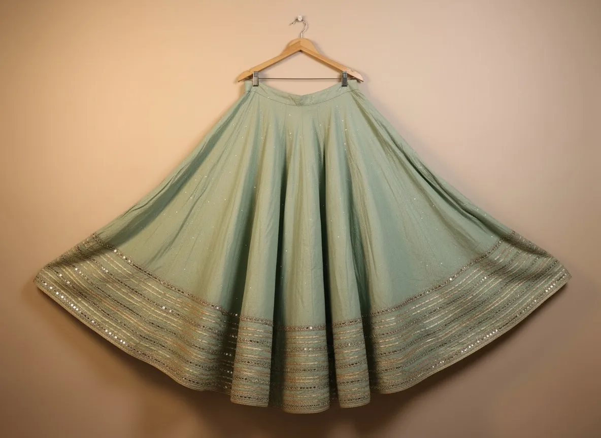 Chandrakala flared skirt with zari sequins all over and multi-tiered gold zari hem border with 8mtr flair—festive sparkle for sangeet and mehendi looks, fits 42-45.